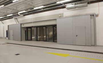In the basic version, the gate wing is closed gravitationally by a counterweight. The door is kept in the open position by an electromagnetic door holder connected to the central fire protection unit. In case of fire risk, the fire-fighting central unit releases the electromagnetic gate holder and the gate wing closes the passage between the fire zones. The gate is opened manually or automatically by an electromechanical drive. It is possible to use DC drive powered by 24V - in such case the door is provided without the counterweight and its opening/closing is carried out by the drive.