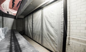 - płaszcz kurtyny jest nawinięty na wał i zamocowany między prowadnicami – zespół ten jest osłonięty systemem osłon;
